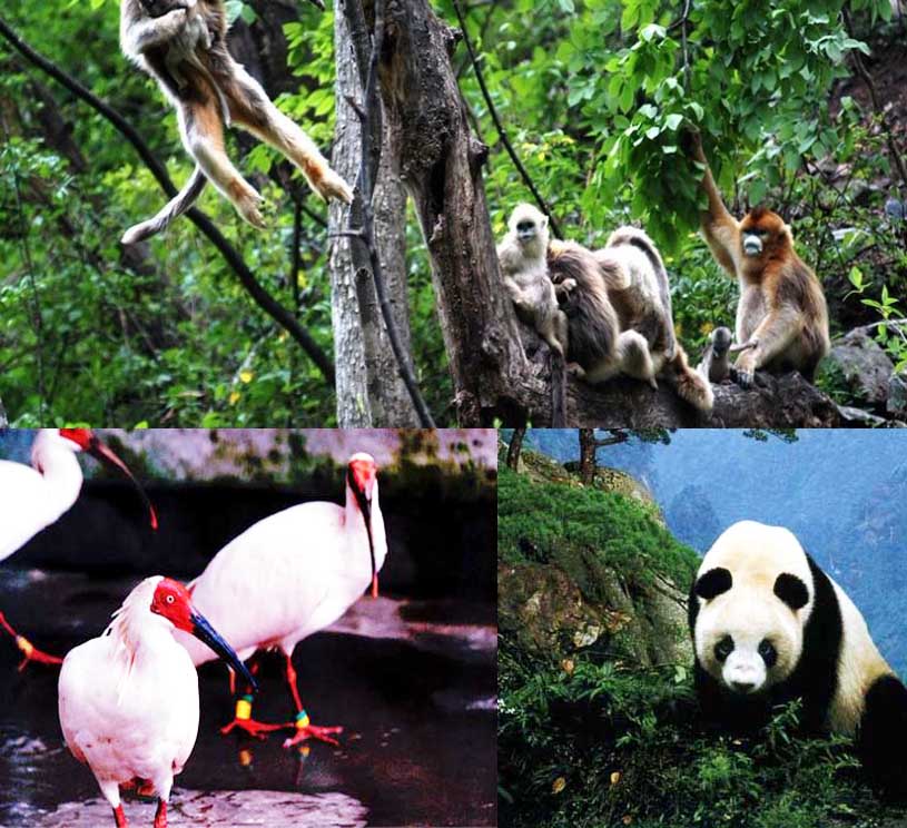 双心池等景点浑然天成,三圣峰、母女峰、栖云峰等天趣神功。秦岭大熊猫野化基地中,熊猫憨态可掬;金丝猴大峡谷里,金丝猴群在树枝灵俏飞跃;红腹锦鸡园内
